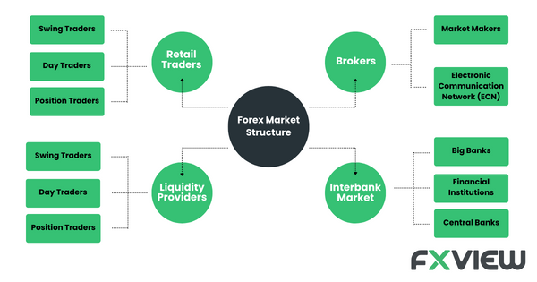 At the base of the Forex market structure pyramid, you'll find retail traders – everyday folks like us, shaking things up from our comfy spots! Retail traders are the life and soul of the market, they bring in excitement and contribute to its vibrant liquidity. They enter the scene through Forex brokers, who give them the tools and access to a variety of financial instruments. Retail traders have diverse backgrounds and have varying levels of experience. Some are day traders, executing multiple short-term trades in a single day. Others are swing traders, holding positions for days or weeks. There are also position traders who take long-term perspectives, holding positions for months or even years.