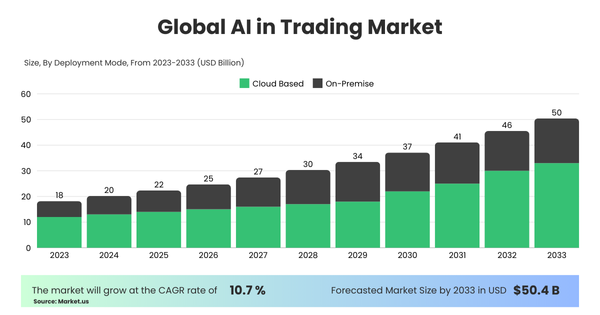In recent years, AI has revolutionised trading and has taken a significant role in reshaping the market. In 2023, the Global AI trading market was worth USD 18.3 Billion and is expected to be worth around USD 50 Billion by 2033.