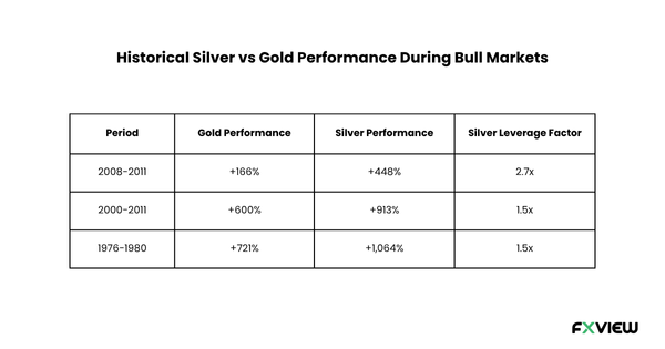 This is supported by historical data. During previous bull markets, silver vs gold performance has shown a clear pattern: silver not only followed gold but also dramatically outpaced it: