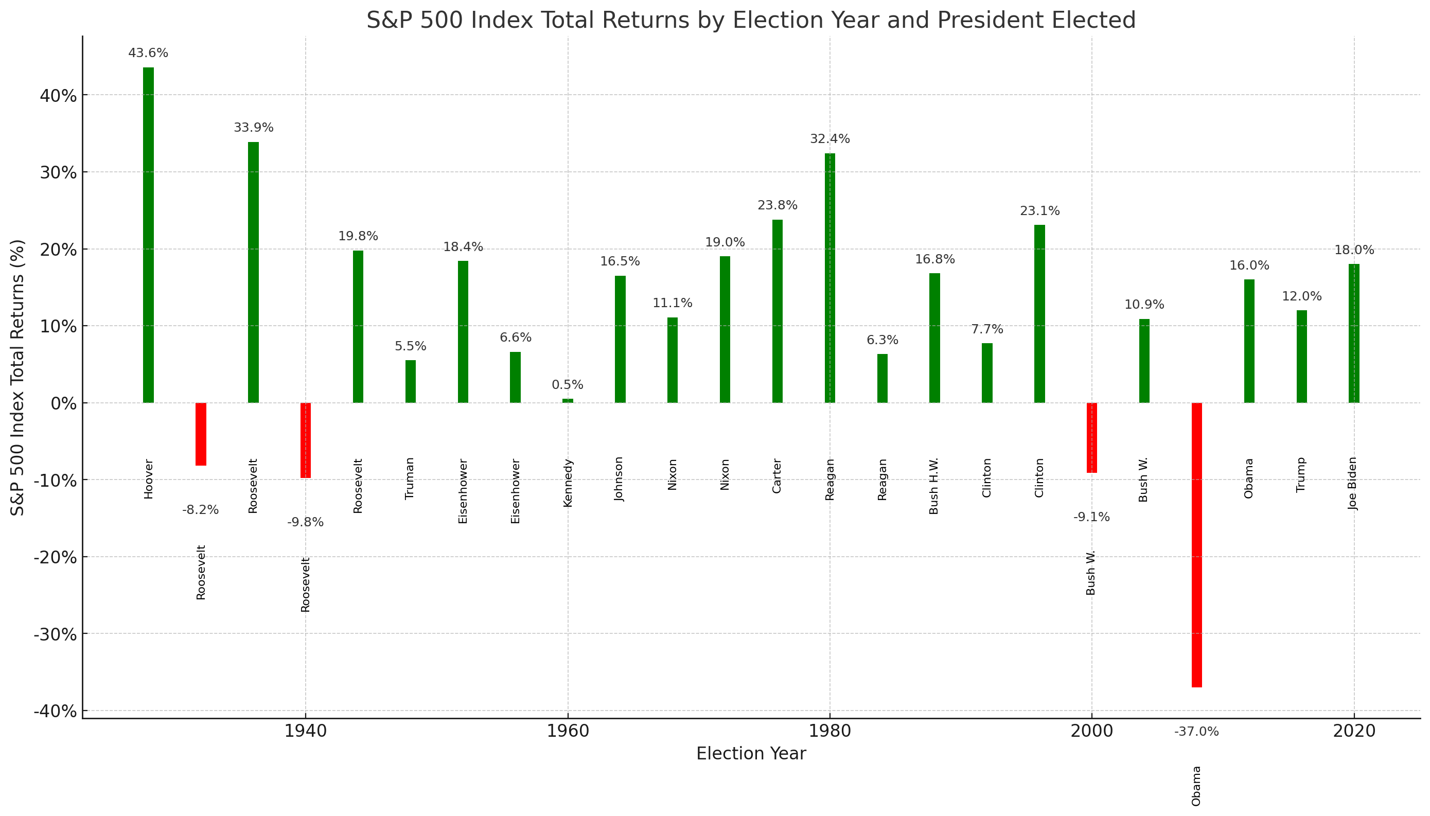 While numerous factors affect the stock market performance, a notable trend is the correlation between U.S. presidential elections results and S&P 500 movement. Historically, the stock market often saw a positive return after the U.S. presidential elections, especially when there has been a change in the administration.